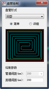 用户可以在盘管形式中选择简单选项,在盘管形式下拉菜单中可以选择多种形式的盘管,有回型、中回型、水平梳型、垂直梳型、水平蛇型、垂直蛇型、单回转型、交叉型,共8种形式,图示为回型;在绘制参数中可以选取管道间距,以及距墙间距的实际数值,在右边下拉菜单中,系统列举了管道间距的推荐取值。