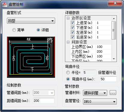 详细绘制相比简单绘制内容,多出了右侧部分选项,用户可以按照不同的盘管形式设置边界区进深值,均为实际距离;按照不同的分区,可设置各区内的管盘间距、盘管的弯曲半径;以及管材参数,用户可在管材或管径右方下拉菜单中可进行选取,也可通过旁边按扭进入管材管径管理器选取。