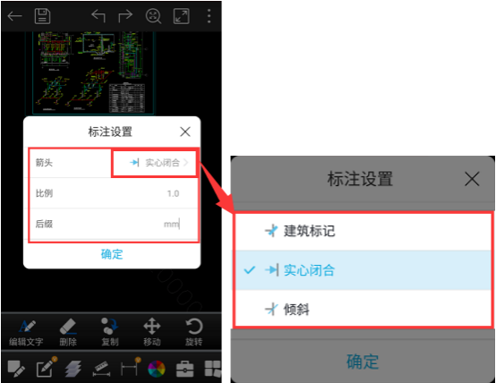 可编辑弧长标注箭头样式;标注结果的比例;还可在结果中添加后缀。